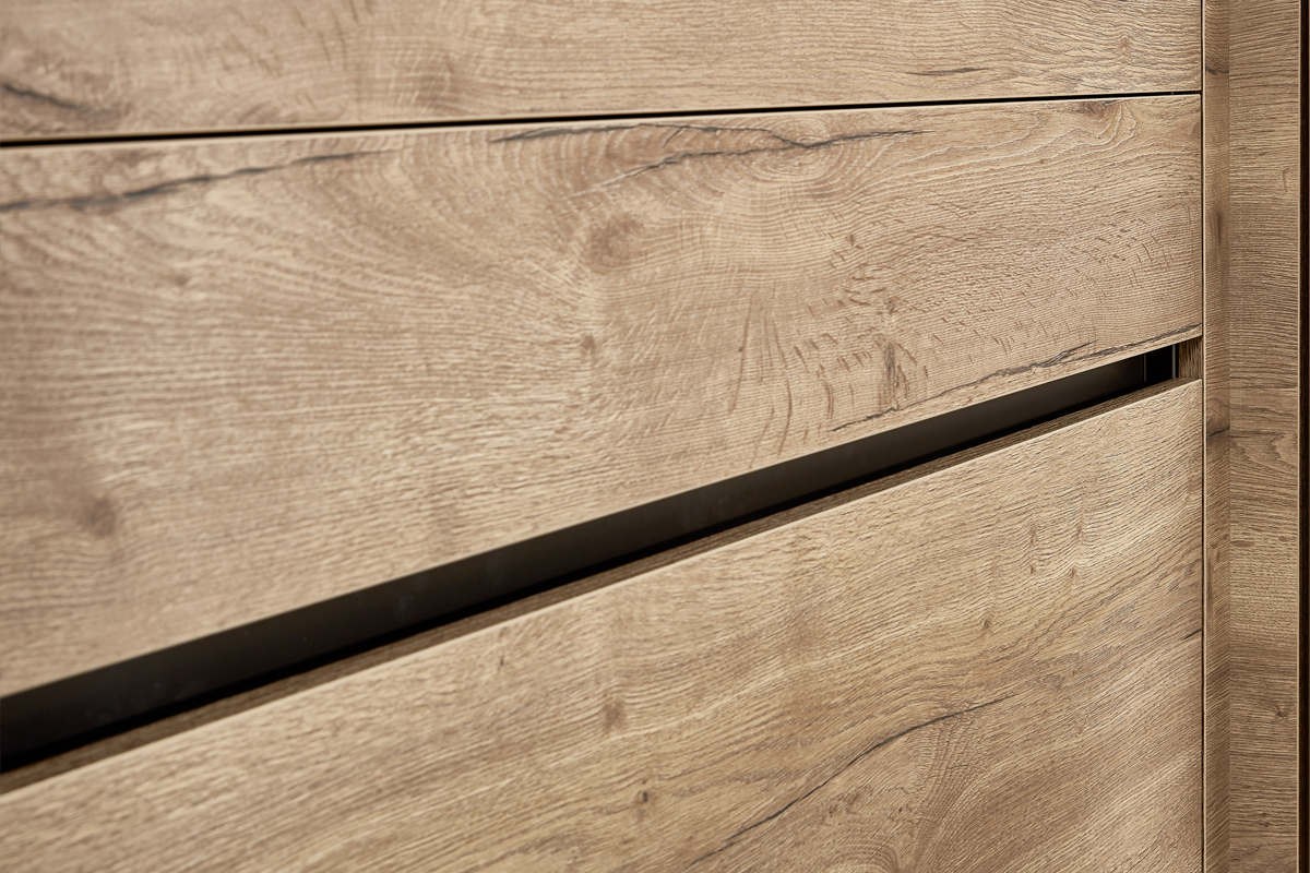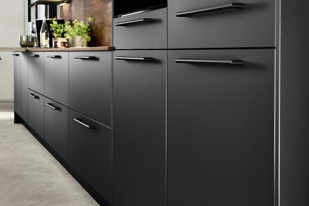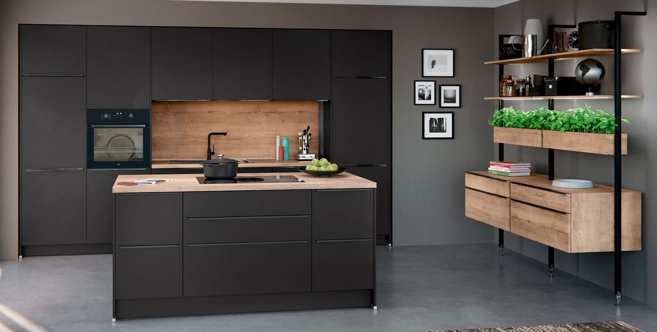 Küche mit freistehender Kochinsel Nobilia Touch / Structura ca. 367 / 185 / 204 x 90 cm, Front: Lacklaminat, Schwarz supermatt / Eiche Havanna Nachbildung, Arbeitsplatte: Eiche Havanna Nachbildung